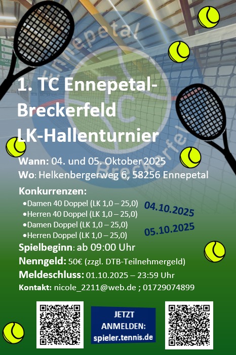 Zum Start der Hallensaison richten wir unser erstes LK-Turnier aus. Angeboten werden folgende Konkurrenzen:Samstag, 04.10.2025: Damen Doppel 40 & Herren Doppel 40Anmeldung unter https://www.tennis.de/spielen/turniersuche.html#detail/745298 Sonntag, 05.10.2025: Damen Doppel offen &[…]